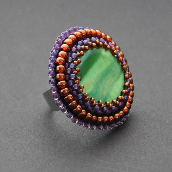 Zielonooki okazały pierścień z masą perłową zaszyty w gold lustered african sunset i silver lined purple na bazie regulowanej.
